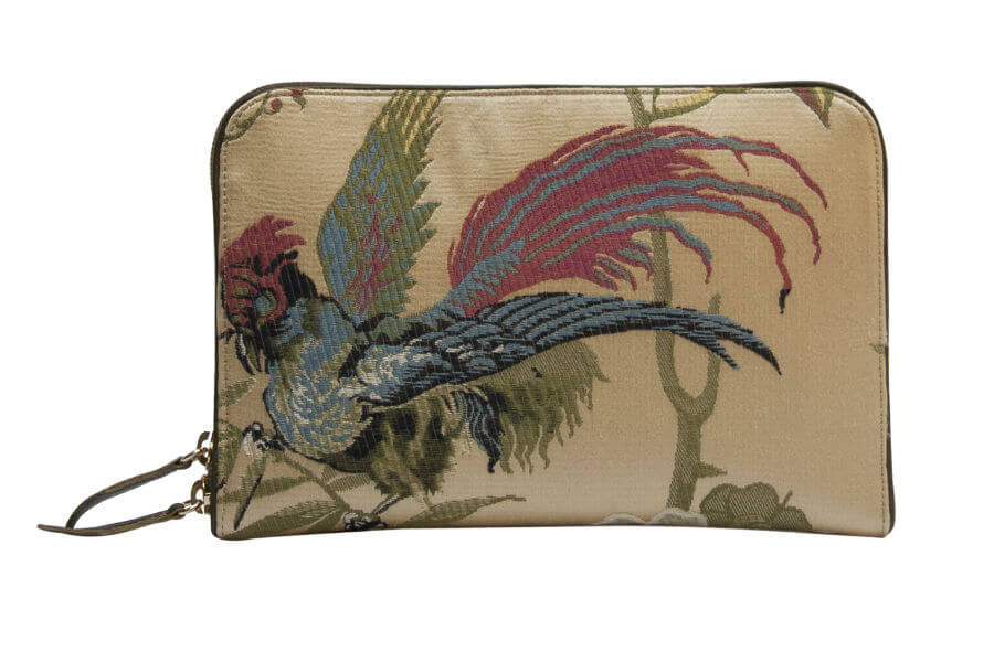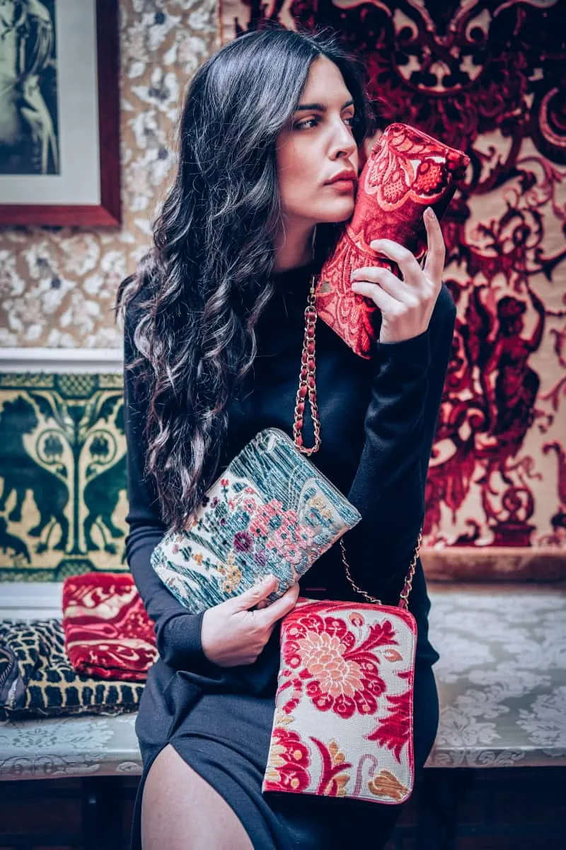 Diese Clutch ist klein, doch kann sie den einzigartigen Stil der Frau, die sie hält, zum Ausdruck bringen. Sie verbindet die Eleganz ihrer Gewebe und Form mit einer praktischen Winzigkeit, aber sie ist geräumig genug, um alle kleinen Objekte zu enthalten, die man für einen besonderen Abend braucht. Man kann sie am Handgelenk dank ihrer Kette tragen, oder über die Schulter, wenn man die beigelegte lange Schlaufe benutzt. Ein charmantes und raffiniertes Accessoire, genau wie die „ehrliche Kurtisane“, deren Name sie trägt, Bianca Cappello.