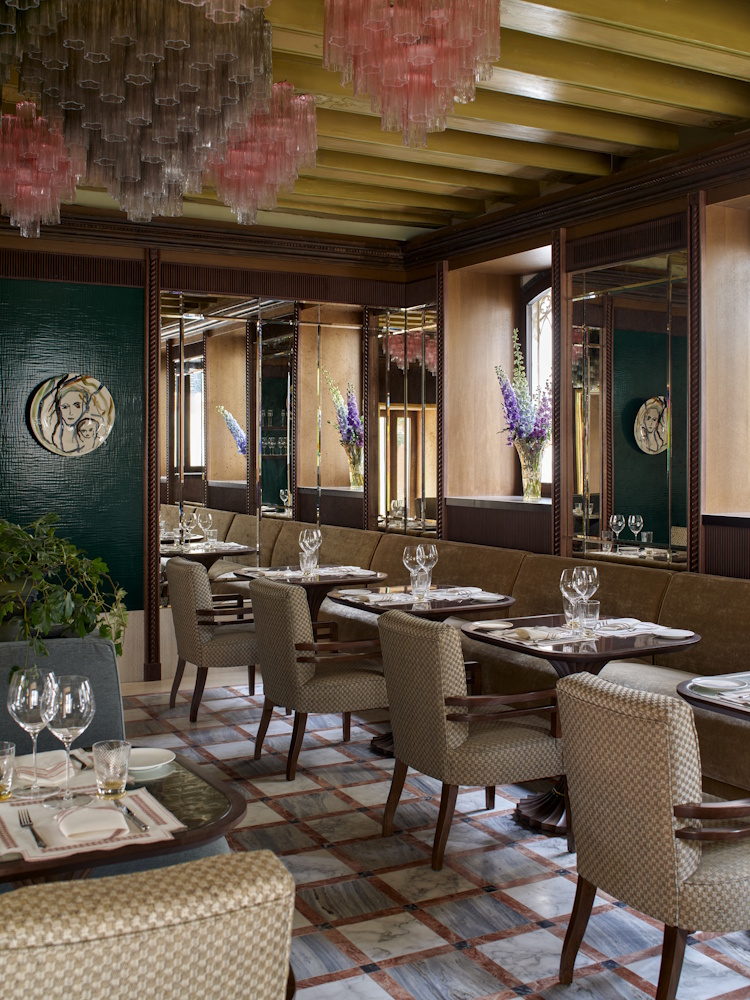 Lo stile dell’hotel è frutto di un connubio sapiente tra conservazione e contemporaneità. L’architetta Aline Asmar d’Amman ha condotto un restauro incentrato sulla valorizzazione di elementi originali: affreschi, pavimenti a mosaico, lampadari in vetro di Murano e la straordinaria scala ottagonale ottocentesca di Giovanni Battista Meduna sono stati preservati e reintegrati nel racconto. Il risultato è un dialogo tra epoche: gotico veneziano, barocco, neoclassico, modernità, in cui nessuna voce sovrasta le altre.
