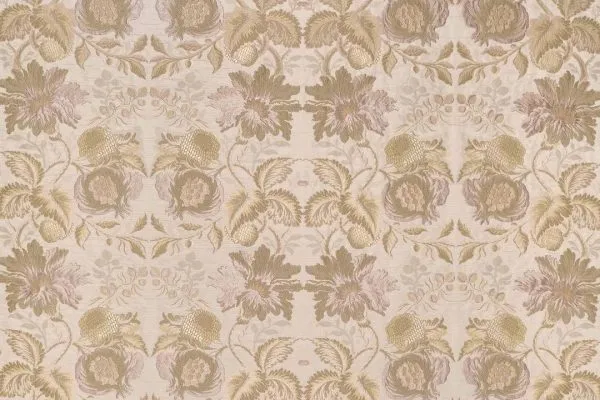 Lo splendido disegno policromo del lampasso Melograno, che raffigura dei melograni, ha un effetto tridimensionale e si stacca netto dal fondo, impreziosito ed illuminato da filati in metallo.